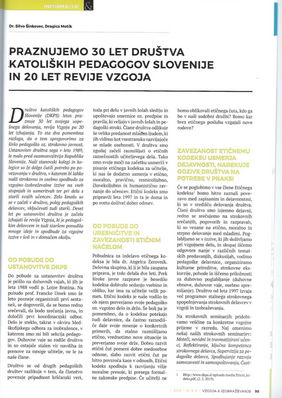 Praznovali smo jubilej: 30-letnico Društva katoliških pedagogov Slovenije in 20-letnico izhajanja revije Vzgoja. Ob tej priložnosti so bili objavljeni prispevki v nekaterih revijah.