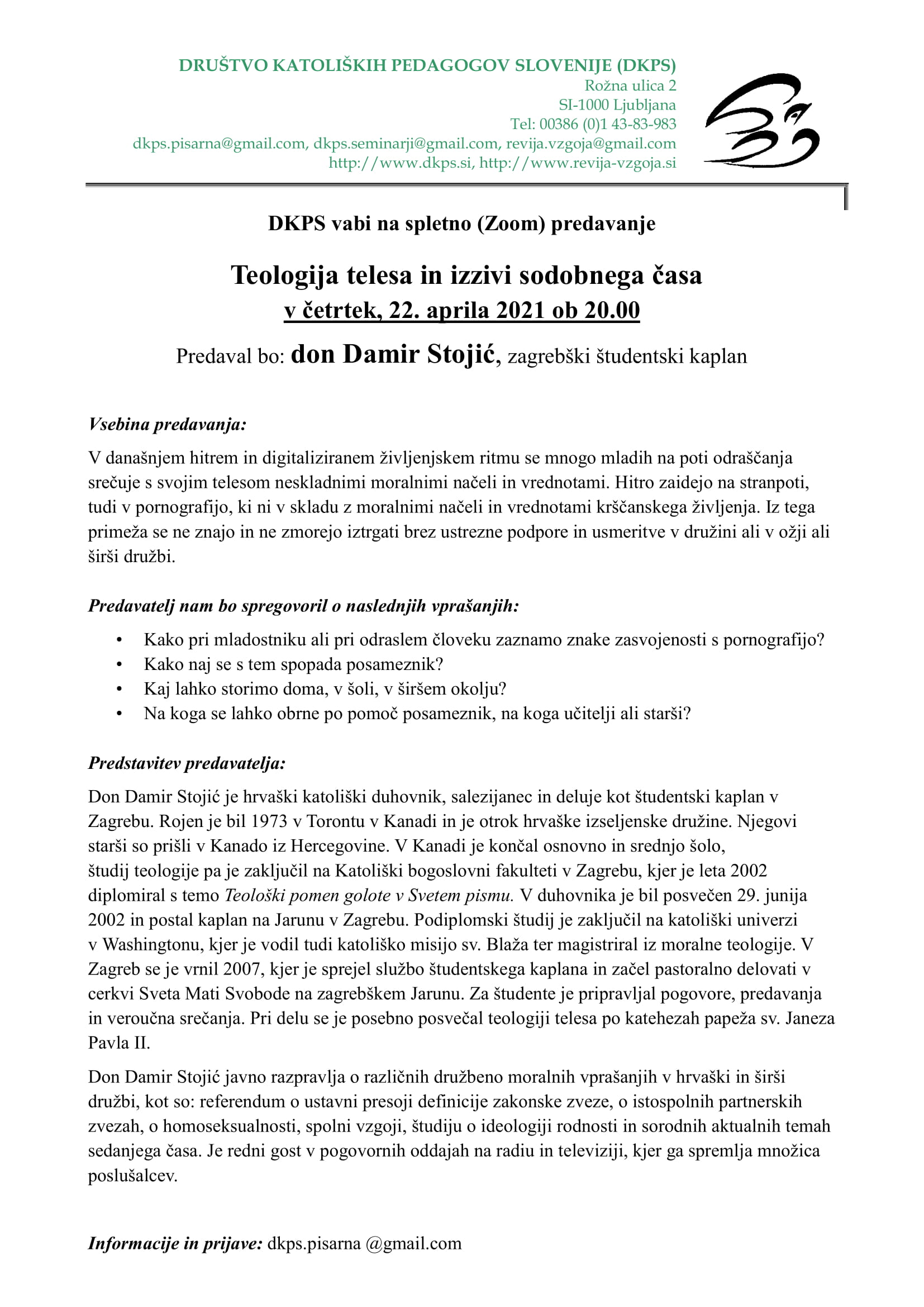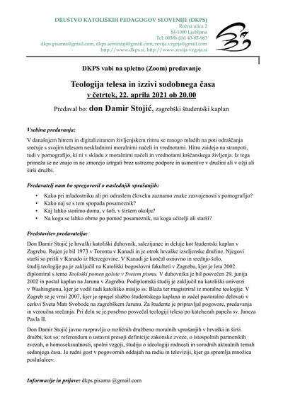 Vabljeni na spletno predavanje Teologija telesa in izzivi sodobnega časa (Damir Stojić), v četrtek ob 20.00 preko Zooma! Prijave na: dkps.pisarna@gmail.com
