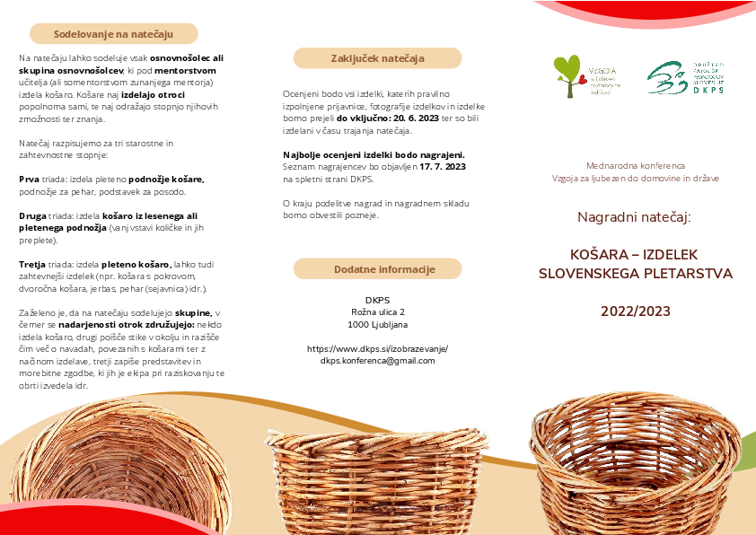 Avtor ali avtorska skupina (s pomočjo mentorja) izpolni izjavo o sodelovanju ter jo do roka za oddajo skupaj s fotografijo svojega izdelka pošlje na naslov dkps.konferenca@gmail.com. Izjava je objavljena na spletni strani organizatorja. Na naslov organizatorja (DKPS, Rožna ulica 2, 1000 Ljubljana) pošlje izdelano košaro.