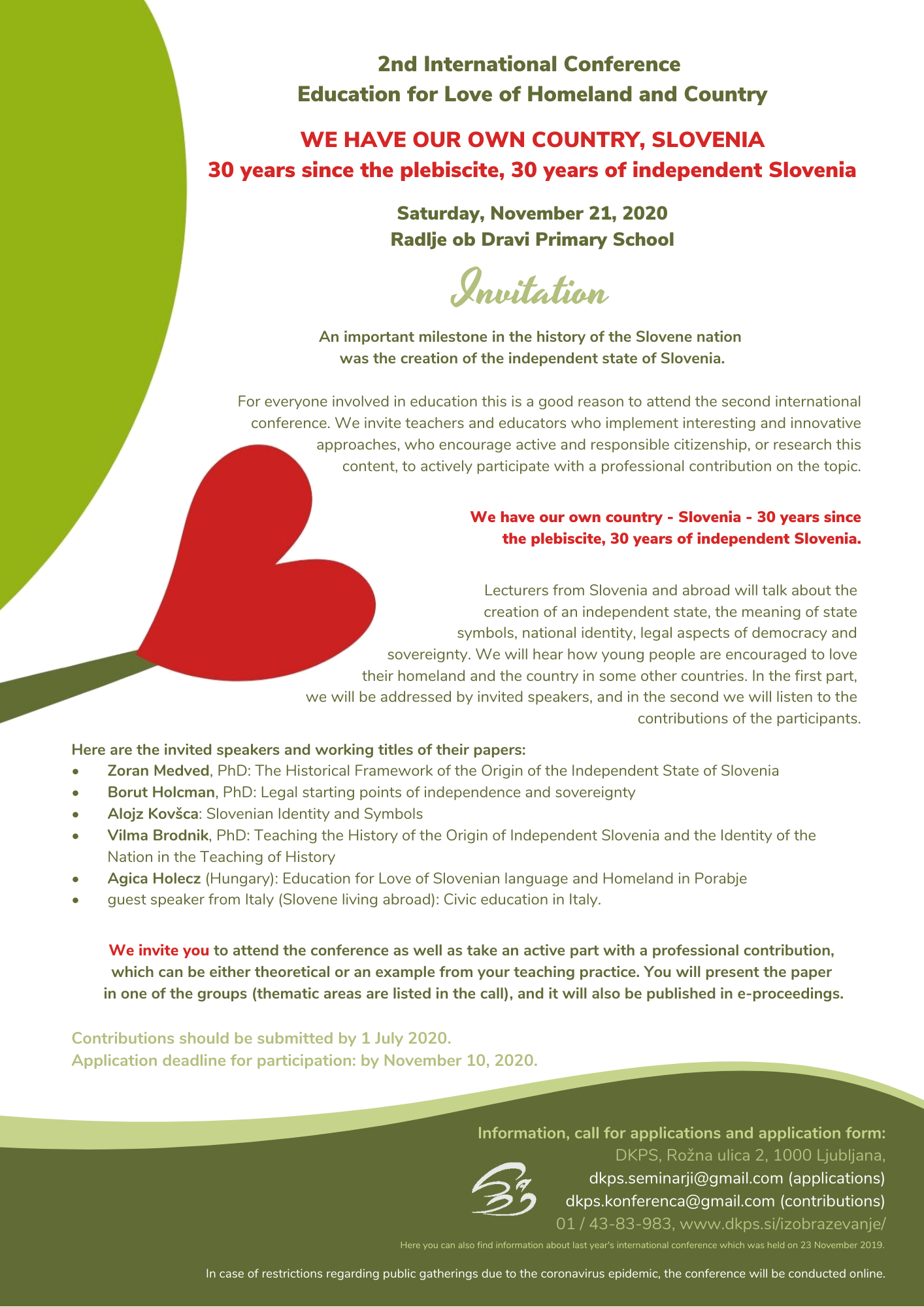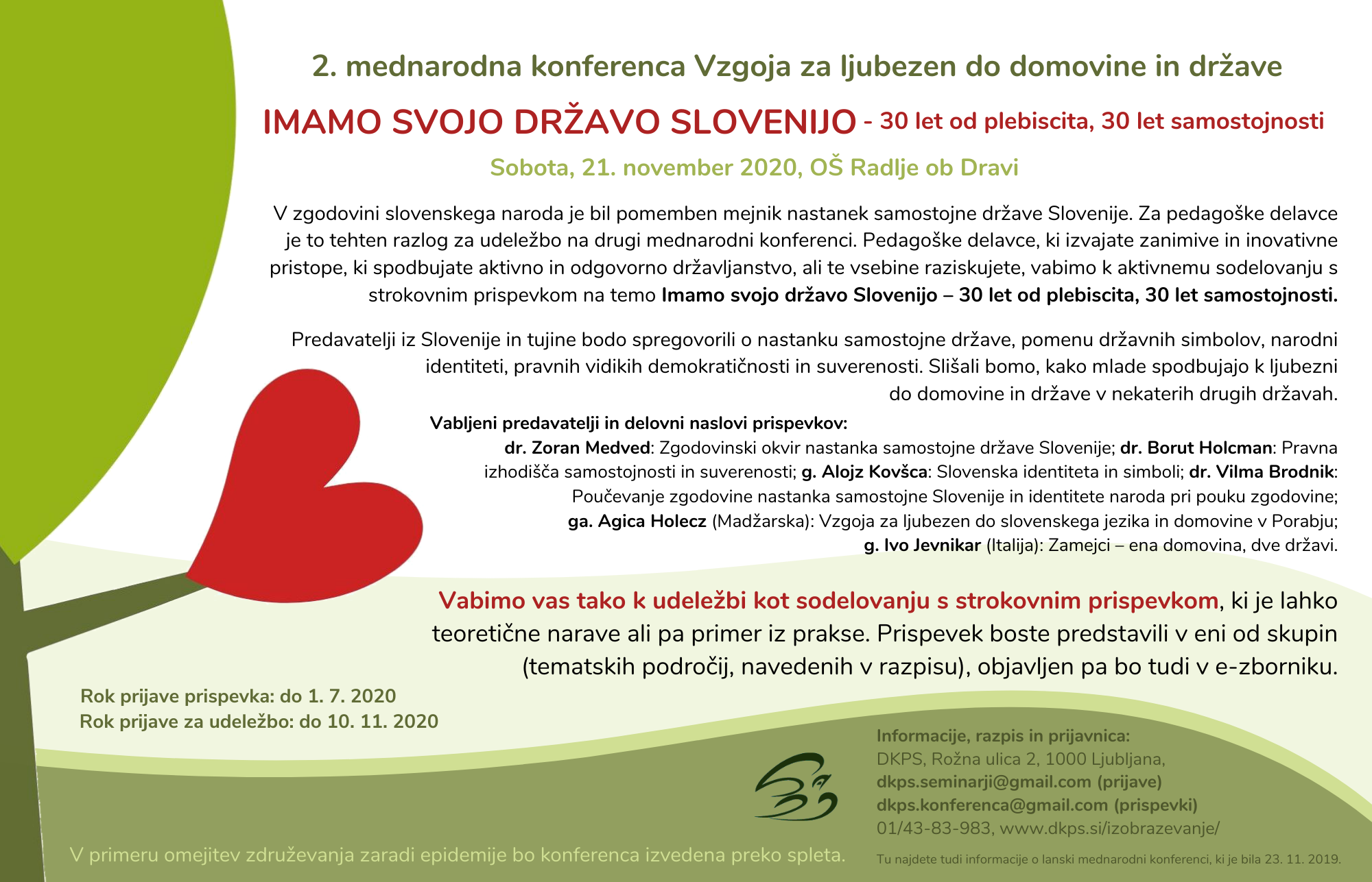 Uspešno smo izvedli tudi letošnjo mednarodno konferenco Vzgoja za ljubezen do domovine in države, z naslovom Imamo svojo državo Slovenijo - 30 let od plebiscita, 30 let samostojnosti. Konferenca je bila 21. 11. 2020, zaradi razmer smo jo izvedli preko spleta.
