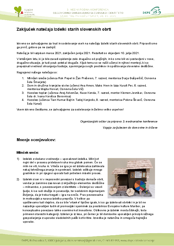 Iskreno se zahvaljujemo za trud in sodelovanje vseh na natečaju Izdelki starih slovenskih obrti. Pripravili smo ga prvič, gotovo pa ne zadnjič.
